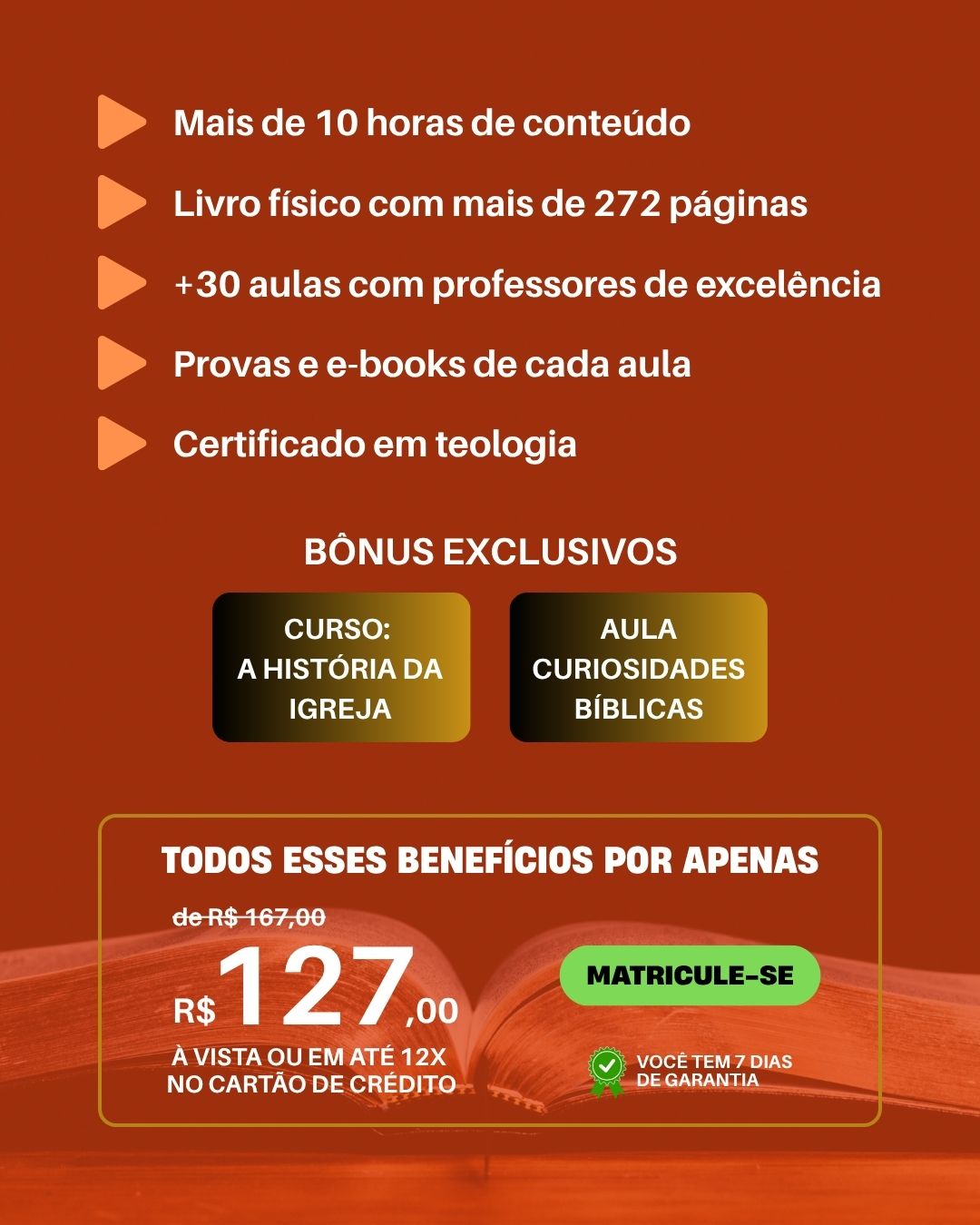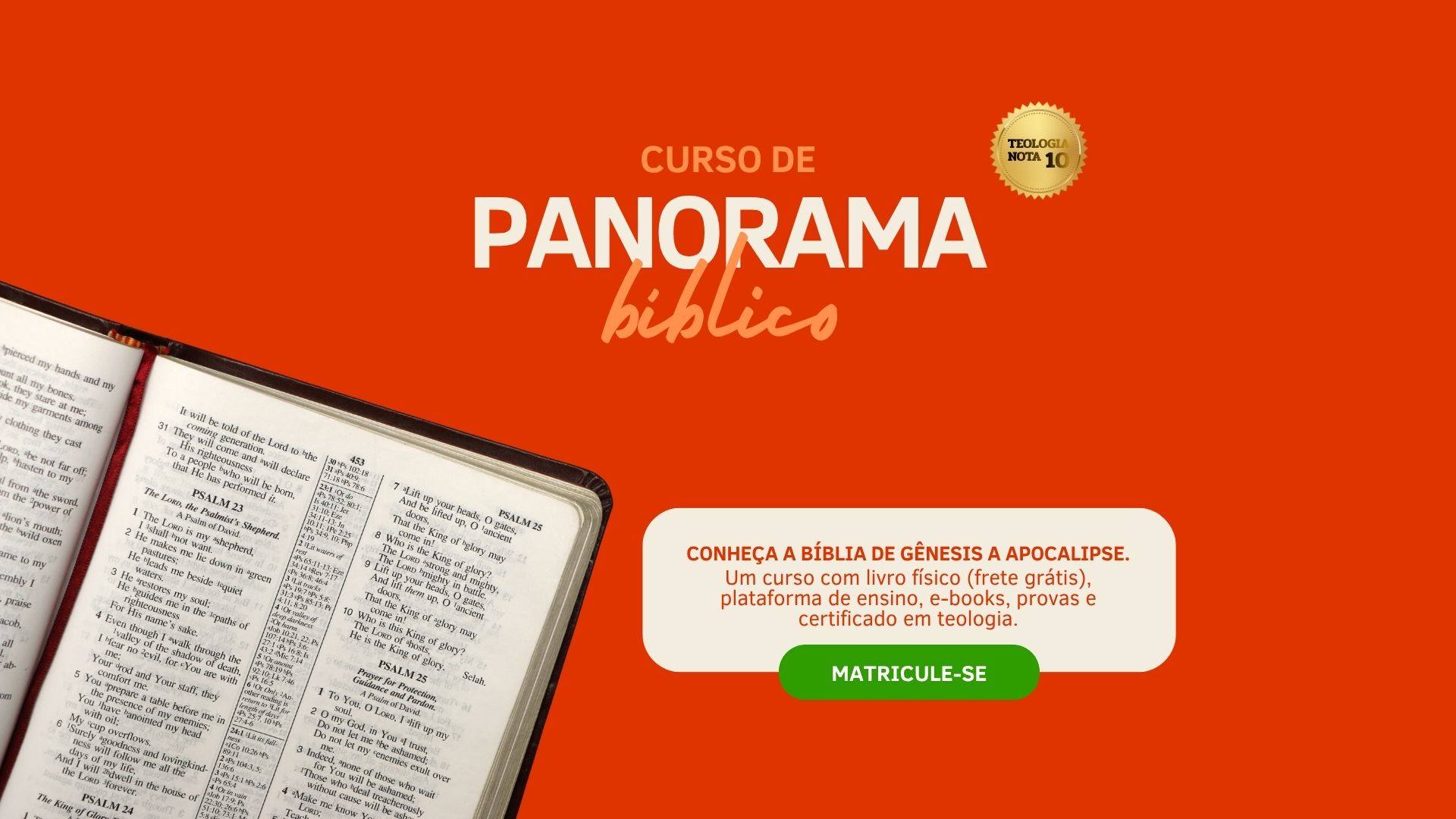 Sim! Ao se inscrever, você recebe o livro físico Panorama Bíblico na sua casa para aprofundar os estudos. Além disso, ganha acesso gratuito ao curso A História da Igreja e à aula especial Curiosidades Bíblicas.